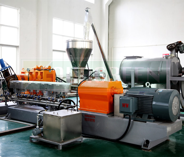 公司采購螺桿、加熱圈、底板、齒輪箱、電機等材料將其配套組成雙螺桿擠出機后投入使用。特有的雙螺桿設計使得原料可以充分混合,有效的確保了終產品的結構和密度。根據物料在螺桿中的溫度、壓力、黏度等的變化特征,可將螺桿分為加料段、壓縮段、均化段和混合段。